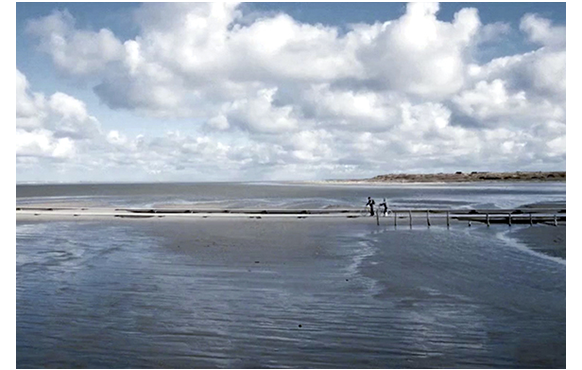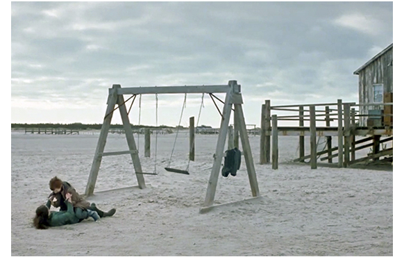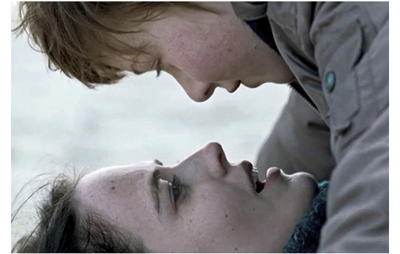孤立したように浜辺に建つ一軒の家。妊娠した中年の女性が、ベランダのイスに座ってコーヒーを飲んでいる。それを背景にして独白が入る。「終わってしまった。でも、私はこれからも あなたに話しかける。返事をもらえなくても構わない。あなたは 去ってしまったけれど、まだここにいる。私がずっと望んでいた贈り物と一緒に。あなたが、最後に下さった贈り物と」。「贈り物」とは赤ちゃんのこと。実は、これは映画の最終画面の続きなのだ。ただし、映画を初めて観る側には、これが「最終画面の続き」とは分からない。映画の主要な配役が表示され、次に映るのが少年と少女が半裸で横になる姿。これは、映画の序盤で出てくるシーンの先取り。そしてタイトルが表示され、本編が始まる。ロケ地はユトランド半島の根元西側にあるハリッシュ・ラニャネス島(1枚目の写真)。ドイツ北端だが、発音はデンマーク語に従った。海岸に佇む少女。この映画の主人公のレベッカだ。そこに偶然一人の少年が通りかかる。彼が、もう一人の主人公トマスだ(2枚目の写真)。一瞬顔を合わせ、すぐに去って行くトマス。レベッカは、そのまま祖父の家に戻る。そして翌日。雨。雨宿りをしていると、そこに昨日の少年が寄って来て、「やあ、僕トミー。君は?」と声をかける。「レベッカよ」。「引っ越してきたの?」。「ううん。おじいちゃんがここに住んでるから、泊まりにきたの」(3枚目の写真)。それだけ話すと、トマスは他の子供たちと一緒に雨の中に飛び出して行った。レベッカが部屋にいると、窓に石が当たり、下でトマスが手まねきしている。もう雨はあがっている。自転車で浜辺に出かけた2人は、打ち寄せる波と戯れる(4枚目の写真)。
