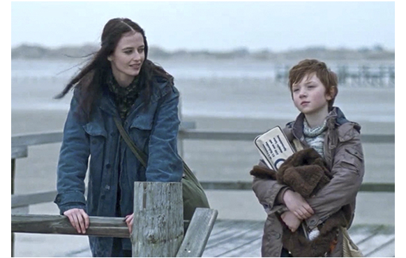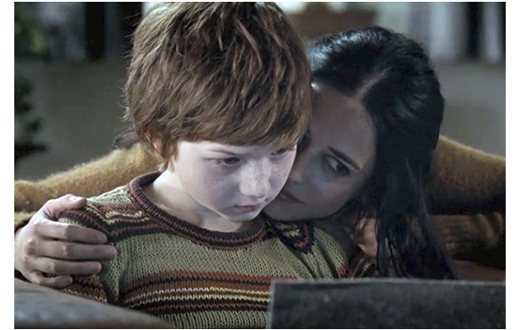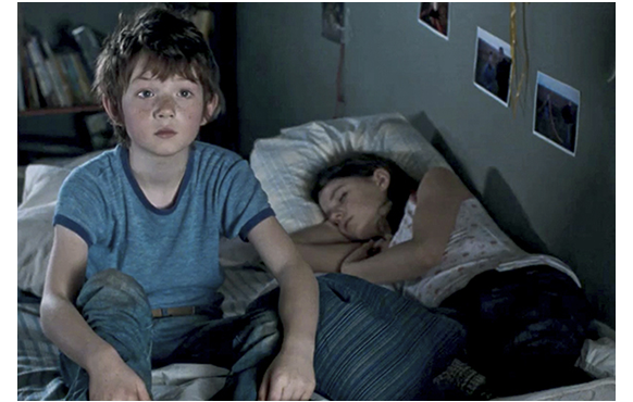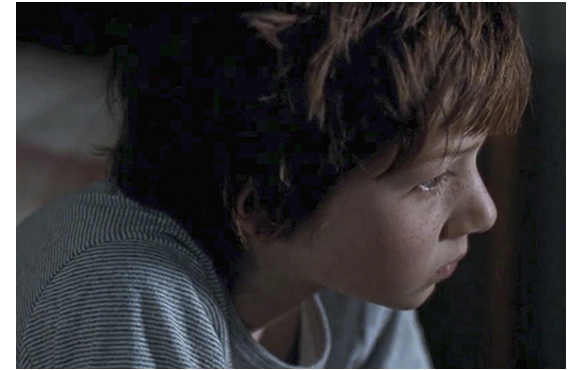 ある夜、買い物にでかけた母が、トマスにプレゼントを持って帰る。ベッドの上に載せ、合図するまで目を閉じさせておき、プレゼントを箱から出す(1枚目の写真)。「もう見ていいわよ」と言われたトマスは、動く恐竜のオモチャに大喜び(2枚目の写真)。恐竜ロボPLEOによく似たオモチャだ。PLEOだとすれば、今でも35000円くらいするので、すごく高価なプレゼントだ。名前は、と訊かれ、「ブーブー」と名付けるトマス。次のシーン。母がトマスと一緒に、昔来た廃船の上にいると、そこに1人の少年が近づいてきて、「僕たち、隣り近所だ」と言って近づいてくる。遊び友達が新しくできたものの、「隣り近所」と言ってもそんなに近いわけではないので、大抵はトマス1人きり。母がパソコンで仕事中は、手持ち無沙汰だ(3枚目の写真)。「お父さんが死んだ時、そこにいたの?」と訊く。「いたわ」。「何が起きたの?」。「なぜ、今、訊くの?」。「さあ」〔暇だから〕。「事故だったわ」。「どんな事故?」。「車を停めて、パパが車から出たところを はねられたの」。普通に答えてきた母だったが、トマスが、「なぜ、停まったの?」と訊くと、「私がおしっこに」と答え、その後は沈黙が続く。レベッカにとっては、辛い思い出だ。