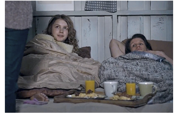 仲良くなった2人は、トマスの部屋に一緒にいる。ベッドの隅で疲れて寝ているレベッカ。するとドアが開き(1枚目の写真)、父が「レベッカ、おじいちゃんから電話だ」と呼びかける。寝ているからと口に指を当てて「しーっ」の合図を送るトマス。「よく眠ってます。起こしましょうか?」。固唾を呑んで見ているトマス(2枚目の写真)。「全然構いませんよ。一晩お預かりします」。にっこりするトマス。「お休み」と言って出て行く父。寝たふりをしていたレベッカは、トマスと枕をぶつけ合って遊ぶ。疲れたトマスが横になって寝ていると、後ろで横になっていたレベッカが体を起こし、トマスの体に沿って指を動かしていく(3枚目の写真)。レベッカはトマスが好きになりかけている。
