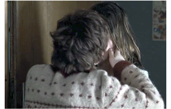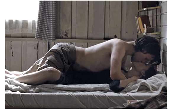 最後に、大人になってからのトマスがどうなるか、簡単に触れておこう。まず、先ほどの続きで母がドアを開ける。2人分の朝食の載ったお盆を持っている。母が、「お早う」と声をかけると、成人になったトマスが顔を覗かせる。隣には年頃の彼女モニカも寝ている(1枚目の写真)。母の表情は何となく暗い。自分の大切なトマスを奪われたような気がするのであろう。モニカを加えた3人でも生活ぶりがしばらく紹介される。しかし、この平穏な状況に一大転機が訪れる。死んだトマスの実の母が、突然やってきたのだ(2枚目の写真)。彼女は、トマスのクローンを作ることに反対し、クローン作製に夫がこっそり同意のサインをしたことも知らずにいたはずだ。恐らく、夫の死に目に打ち明けられたのであろう。そうでなければ、夫も同行しているはずだ。もちろん、クローンのトマスは、訪ねて来たのが誰かは全く分からない。だから、「お困りですか?」と訊く。その顔を穴が開いたように見入る実母。レベッカは、「中に入ってなさい、トミー」と言う。それを無視して、「あなた誰?」と無邪気に訊くトマス。何も応えない実母。彼女は何も言わず、レベッカにそっと触れて立ち去っていった。触れたのは、息子に再会できた感謝の意味か、あるいは、許すというサインかのどちらかであろう。心穏やかでないトマスは、母に「あれ誰、ママ」と訊くが、母は涙を流したまま黙って小屋に入ってしまう。夜になり、トマスは母のベッドに行き、「あの人 誰だったの?」と訊くが、母は頭を撫でるだけで何も言わない。翌日のトマスは荒れていた。そんな状態が続き、愛想を尽かしたモニカは出て行く。意を決した母は、「あなたに言いたいことがあるの」と言い、「私が9歳の時、浜辺にいた。とても寒かった。その時、この少年と会ったの」と言う。「何? どの少年? 浜辺って? それより、あの人は誰なんだ、母さん」。じっとトマスの顔を見て、母は古い箱を渡す。中に入っていたのは、古いノートパソコン。かつて、本物のトマスの持っていたものだ。そこに入っていたのは、自分の子供時代の写真(3枚目の写真)。ただし、一緒にいるのは母ではなく、先日見た謎の女性と、見知らぬ男性だ。成人になってからの動画もある。自分と同じ顔をしているが、別の人間だ。ようやく真実に辿り着いたトマス。最初の言葉は「怖いよ」。そして、「あんた、誰なんだ? それに、僕も 誰なんだ?」。怖い言葉だ。「ママ、あんたは誰?」「なぜ、こんなことをした?」。「自分を見なさいトミー。あなたは、ここにいる」。「それで? それがどうした?! 僕はどうすりゃいい? こんなクソ人生、どうしたらいいんだ? 自分が誰かも分からないんだぞ! この気持ち 分かるのか!?」。母は冷静だ。「これ以上、何を望むの? あなたはここにいて、生きている」。トマスは「誰なんだ?」とくり返して訊き、いつしか2人は愛し合う(4枚目の写真)。そして翌日、トマスは、「ありがとう、レベッカ」と言い、永遠に家を去って行った(5枚目の写真)。レベッカという名前を言ったということは、クローンを作ることになった経緯を聞いたのであろう。だからこその「ありがとう」なのだろう。映画はここで終了するが、その先が、冒頭のシーンだ。最後に愛し合ったことで、レベッカは、トミーのクローンの子を妊娠している。これこそが、レベッカの本当に欲しかったものかもしれない。
