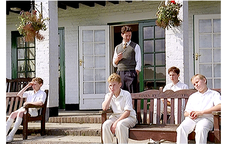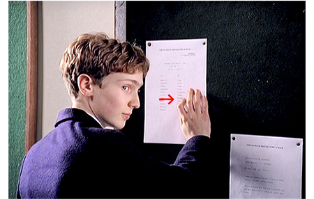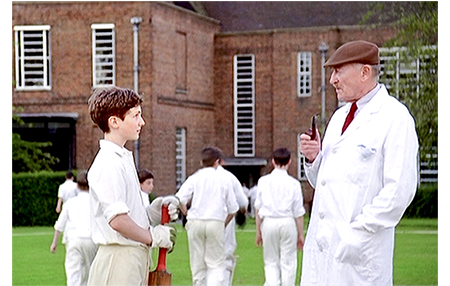 火曜日、デイヴィッドが部の掲示板を見に行くと、そこには試合のメンバー表が貼ってあった。6月17日(水)の午後2時半から始まる部内対抗戦のメンバー表で、書かれているのは1軍11名と2軍11名。デイヴィッドの名前は、2軍の7番目に記載されていた。2軍とはいえ、選手に選ばれたのだ(1枚目の写真)。そして、翌水曜日。デイヴィッドがバッツマンの番になると、1軍のウィケットキーパーが、「君の仕事はスコアリングだと思ってた。荷が重過ぎないか?」と皮肉を言う(2枚目の写真)。しかし、デイヴィッドは第1投を見事に打ち、フィールダーも取れない。ピッチを往復できたので2ランが入ったことになる。映画では、分かりにくいが、クリケットの場面は、途中から、その週最後の試合に変わり、デイヴィッドの「Wickets」は42となり、待機している部員から拍手が起きる。ピューは、「とても良かった」と褒める。そして、「最初の1週間見ていたが良くやった。ジュニアチャレンジカップにも出場できるだろう。我々の弱点はミドル・オーダー〔5~8番〕のバッツマンだからな〔ミドル・オーダーはオールラウンドプレーヤー向きの順番で、ソバーズは常に6番だった。因みに、デイヴィッドの1軍での順番は6番となるが、これは高い評価の現われ〕。君にやってもらう」と1軍の11人に入れると言ってくれる。デイヴィッドは他の部員から取り囲まれ、「ピュー先生は、何て言ったんだ?」と訊かれる。そして、キャプテンから握手され、チームの一員として迎えられる(3枚目の写真)。