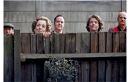パーティが終わり、2家族が家に戻る。サミュエルズ家では、デニスに目を閉じさせて、家族全員で裏庭に導いていく。そして、「開けていいわ」と言われてデニスが目を開けると、そこにはきれいに作り直されたクリケット・ネットがあった(1枚目の写真)。デイヴィッドの家の反対側の裏庭からは、ネットの再建に携わった人たちが笑顔を浮かべて見ている(2枚目の写真)。中には、「ヤセ女」もいる。デイヴィッドの家の裏庭では、父と母と妹が笑って見ている。デイヴィッドは自分の部屋から笑顔を見せている(3枚目の写真)。ネットの再建は、地区としてのサミュエルズ家に対する謝罪と和解の象徴であろう。デブ女がいないのは、恥ずかしくなって住んでいられなくなったと思いたい。