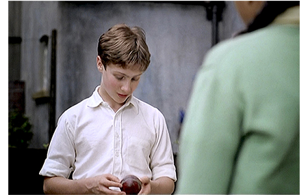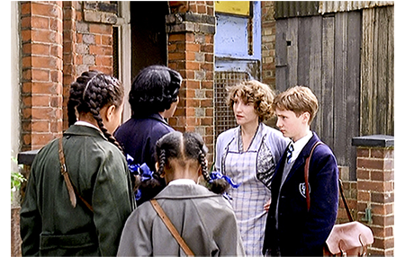 テラスハウスは貧相だが、分厚い煉瓦で出来ているので火災には強い。だから、サミュエルズ一家も、燃えた室内を片付ければ、そのまま住み続けることができる。そして、誰も怪我することなく脱出できたのは、デイヴィッドが素早くジュディに教えたからだ。だから、次に、デイヴィッドが玄関をノックすると、ドアを開けた夫人は、「デニスとジュディは裏だで」と言って中に入れてくれる(1枚目の写真)。2人は、燃えたネットの後片付けをしている。デイヴィッドは、火事のことも、ネットのことも言わず、いきなり、「僕の両親は、引越しのこと黙ってた。僕は、あなた達がいるからここにいたい。初めて持てた素晴らしい友達なんだ。パーティの時は本当に悪かった。僕がバカだった」(2枚目の写真、一応涙を浮かべてはいるが…)。さらに、「僕は、あなた達の隣に住んで、クリケットをやりたい」と言う。デニスは、誤りを認めたことを讃え、ジュディに。「デイヴィッドの謝罪、受け入れるだか? お前が選びゃいいで。嫌ならそれでええ」と尋ねる。ジュディは、謝罪を受け入れて握手する(3枚目の写真)。その後で、デニスは、両親と一緒に引っ越すよう 優しく諭す。デニス役のデルロイ・リンドーは実に良い味を出している。