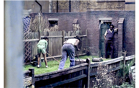 デイヴィッドが帰宅すると、隣の家への引越しが始まっていた(1枚目の写真、矢印は荷物運びとぶつかりかけたデイヴィッド。周りの人も様子を窺っている)。デイヴィッドは、じろじろ見るのは失礼だと注意されたので、自室からこっそり様子を窺っている。部屋の窓から見えるのは、どのテラスハウスにも付いている長方形の細長くて狭い裏庭。そこには、前の家族が中央にバラを植えていた(2枚目の写真)。手伝いに来た男が、「トイレはどこだで?」と訊き、「中だで」と嬉しそうに女性が答え、「冬にカゼ引かんでいいな」と男が言う。ジャマイカでは、トイレは屋外だったのだろう。デイヴィッドは、クリケットカードで遊び始める。すると、今度は、玄関のある通りからクラクションの音が聞こえ、母親と娘2人が到着する。迎えに出たのは、大男の父親。全員英語を話すが、文法はかなり間違っている。その光景を、周りの住民が出てきてじっと見ている。新しい住民はジャマイカ移民だった。解説で述べたノッティング・ヒルの人種暴動から1年8ヶ月。火種は残っていて、ジャマイカ移民に対する差別意識も強い。ユダヤ人さえ快く思わないこの地区の住民は、あからさまな敵意を持って引っ越してきた一家を迎える。夜は、引っ越してきた家から大音量の音楽が流れ、夕食の頃には母のイライラはピークに。父は、「荷解きしてるのさ」と言うが、母は、「歌って叫んで笑って」と不機嫌そのもの。娘が、「寝室3つしかないのに、何人暮らすのかな?」と訊く。父:「さあ、50人かな」。母:「何か、他のことでも話したら?」。