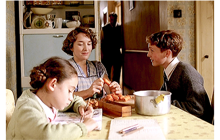 ネットでの練習を目にしたデイヴィッドは、夕食の準備をしている母のところに駆け下りて行き、「クリケットのネットだ」と興奮して話しかける(1枚目の写真)。次のシーン。デイヴィッドが父と一緒にシナゴーグでの礼拝に出かけた折、父は、隣にいた男性から「新しいお隣さんはどうだ?」と訊かれる。「誰から聞いたんだ?」。「小鳥さ。黒い鳥だがな」〔差別発言〕。「問題なんかない」。その日の夕食時、母は、「話しかけられたら ちゃんと応対しなくてはいけないけど、その時だけよ〔as far as it goes〕」と隣人に対する対応の仕方に念を押す。一見、人種無差別に見えた父も、「我々と同種の人たち〔our kind of people〕じゃないんだ。いいな?」と釘を刺す(2枚目の写真)。「背を向けなくてもいいが、仲良くする必要はない」とも言う。翌日、デイヴィッドがクリケットカードと遊んでいると、デニスがジュディを教えている声が聞こえてくる。すごく丁寧な教え方で、デイヴィッドがこれまで一度も見たことのないものだった〔デイヴィッドは、誰からも指導を受けたことがないので、スコアラーにしかなれなかった〕。