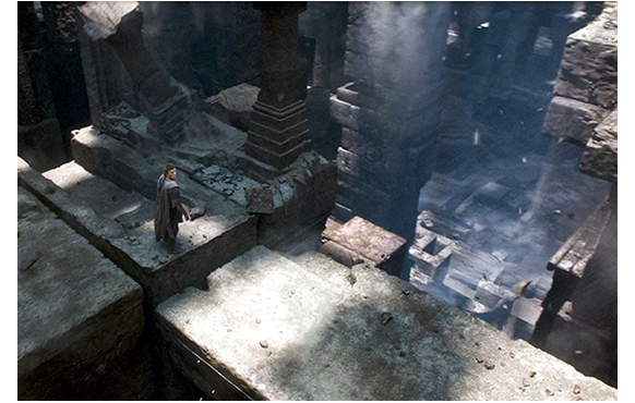 この言葉に押され、息子を連れてゼウスに会いに行くペルセウス。「どこに行くの?」。「父と話がある」。神殿が半分崩壊しているのに驚く2人。しかし、さらに衝撃的だったのは、瀕死のポセイドンから父ゼウスが捕らえられたと聞かされたこと。ポセイドンは神器の三叉の矛を息子アゲノールに渡せと言って死ぬ(金の塵となる)。