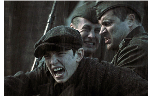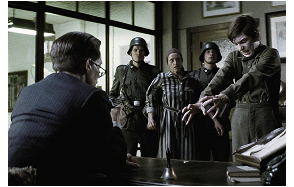 ポーランドには、アウシュヴィッツ他、全部で11ヶ所の強制収容所が設けられたが1944年の段階では8ヶ所。その どこかは不明だが、ある雨の降る夜、エリックと両親の3人が、他のユダヤ人たちと共に収容所へ向かう鉄条網の通路を歩いている。フェンスの中では、多くのユダヤ人が囚人のように働かされている。収容所に近付くと、子供だけ別にされてしまう。両親を含めて大人達が入っていった後に閉められた頑丈な鉄の門。両親と引き離されたエリックは、両親に向かって絶叫する(1枚目の写真)。そして、その絶望感と怒りで、閉じられた門は捻じ曲げられ、開き始める。それを止めようとした兵士に銃で頭を殴られ、エリックは気絶する(2枚目の写真)。その様子を、偶然、シュミット博士が窓から見ていた。