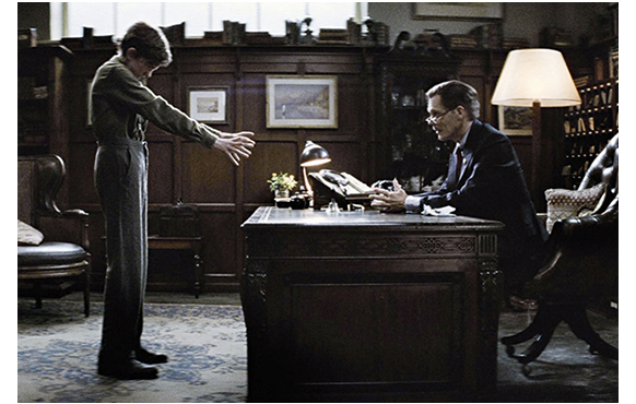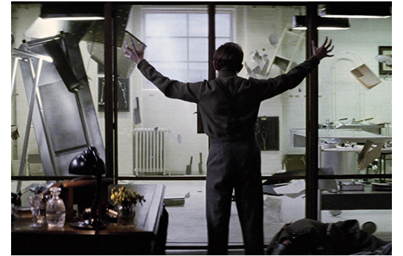 再度、強制収容所。シュミット博士の研究室で。博士に呼ばれたエリックが机の前に立っている。博士はエリックに気さくに話しかけ、チョコレートを勧める。安心したエリックが、「ママに会わせて」と頼むと、博士は「遺伝子は新しい時代の扉を開く鍵だ。人類にとっての新しい未来… 進化だ」と言ってから、「私の話してることが分かるか?」と尋ねる。首を振るエリック。「簡単なことを やって欲しい。大きな鉄の門に比べれば小さなコインなど たやすいはずだ。違うか?」。エリックは何とかコインを動かそうとする(1枚目の写真)。しかし、怒りに任せて意識せずにやった行為と、自分で念じて行う行為とは、もしそれが初めただとしたら、全く違う。だから、コインは動かない。「やってみましたが、できません。不可能です」と謝るエリック。博士は、「ナチスが効果的な方法を編み出したことは、認めていいな」と他人事のように言うと、予め事態を予測していたように、エリックの母を部屋に入れる。そして、「これから、やることがある」と言うと、机から拳銃を取り出しながら、「これから3つ数える。その間に コインを動かせ。動かさないと、引き金を引く」と言い、拳銃を母に向ける(3枚目の写真)。カウントが始まると、エリックはパニックを起こし、意識を集中できない。「3」と同時に母は射殺される。倒れた母を見たエリックの怒りはすさまじく(4枚目の写真)、呼び鈴を潰し、博士の後ろにあった棚を潰し、母を連行してきた兵士のヘルメットを潰し、背後にあった実験室の中をメチャメチャにする(5枚目の写真)。怒りが収まり、母の死を悲しむエリックに寄り添う博士。「素晴らしいぞ、エリック。君の特別な才能が、怒りで解き放たれたんだ。君と私で、これから楽しいことをいっぱいしよう」(6枚目の写真)。シュミット博士は、この映画だけに登場する悪役No.1だが、エリックの持つ孤高の雰囲気は、こうした生い立ちによって醸成されたことがよく分かる。