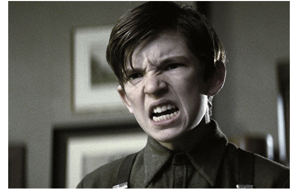 ポーランドには、アウシュヴィッツ他、全部で11ヶ所の強制収容所が設けられたが1944年の段階では8ヶ所。その どこかは不明だが、ある雨の降る夜、エリックと両親の3人が、他のユダヤ人たちと共に収容所へ向かう鉄条網の通路を歩いている。フェンスの中では、多くのユダヤ人が囚人のように働かされている。収容所に近付くと、子供だけ別にされてしまう。両親を含めて大人達が入っていった後に閉められた頑丈な鉄の門。両親と引き離されたエリックは、両親に向かって絶叫する(1枚目の写真)。そして、その絶望感と怒りで、閉じられた門は捻じ曲げられ、開き始める。それを止めようとした兵士に銃で頭を殴られ、エリックは気絶する(2枚目の写真)。その様子を、偶然、シュミット博士が窓から見ていた。