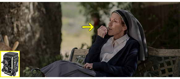 翌日、叔父は、邪魔なオスカーを一人で買い物に行かせる。村で唯一の商店の並ぶ通りに行ったオスカーは、自転車に乗ったシスターとすれ違う。その時は、相手が動いていたので撮れなかったが、シスターの後を追って行ったオスカーは、彼女が木陰のベンチに座ると、オスカーは好機と捉えてカメラを構える(1枚目の写真、矢印、C220の印付き)。このあと、12枚を撮り終わったオスカーは、嬉しそうに、カメラから取り出したフィルムをエリックに見せ(2枚目の写真、矢印)、エリックは、「お前さんの撮った第一号のフィルムだ」と言って受け取る(3枚目の写真)〔前にも書いたが、オスカーは、どうやってカメラから取り出したのだろう? C220のブローニー判フィルムはカートリッジに入っておらず、遮光紙に重ねてスプールに巻き付けているだけの単純な構造なので、フィルムの取り出しは暗室で行うべきだし、取り出したフィルムをこんな風に明るい所で見せて感光しないのだろうか?〕。