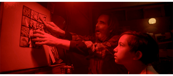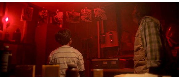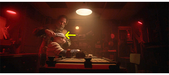 エリックは、「オスカー、我が友よ、ここで魔法が起きるんじゃ」と言うと、オスカーを暗室のドアに連れて行く(1枚目の写真)。中は、エリックが長年使わなかったので、大事な装置2ヶ所にビニールカバーが掛けてあり、それをエリックが乱暴に取り去ると、大量の埃が舞う。エリックは、自作の引き延ばし機を自慢する。エリックは、将来オスカーが自分で現像作業ができるように、白熱電球を点けたまま、不要になった古いフィルムを取り出してみせ、それを金属製のフィルムリールにゆっくりと巻いてみせる。そして、半分ほど巻いたリールをオスカーに渡すと、最初はそのまま巻かせ、次いで、暗闇でも同じことができるよう、タオルを目の周りに縛りつけて、作業を続けさせる(2枚目の写真、矢印)。そして、巻き終わったフィルムリールを円筒状の金属容器に入れさせ、蓋をさせ、目隠しを外す。「次は、魔法の薬じゃ。これで奇跡が起きる。現像液じゃ」と言って瓶を見せると、金属容器の中に注ぎ入れる。古い機械式のタイマーを10分にセットすると、振るように容器を動かし、時々、容器でテーブルをトントンと叩く。そして、すぐにオスカーに代わって作業を続けさせる(3枚目の写真、矢印)。エリックは、「これでフィルムから泡が落ちる」と説明する。タイマーが鳴ると、容器の中の現像液を捨てる。