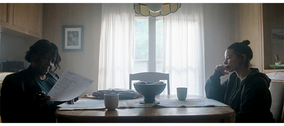 エヴリンがキッチンで洗い物をしていると、ドアがノックされる。エヴリンがドアを開けると、そこにいたのはDCF〔児童家族局〕〔CPS(児童保護サービス)ではない〕の女性。訪れた理由は、桟橋でオスカーがコナーに野卑な言葉で罵られたことに対する通報が局にあったから。そこで、担当者は、子供がそのような環境に置かれるような家庭の状況を調べに来たのだった。担当者は、この漁村に引っ越した理由、オスカーがそれに対してどう思っているか、オスカーが声の出ないことに対し再診断はしたか、など詳細に尋ねる(1枚目の写真)。映画を観る上で重要な情報は、なぜオスカーが口を聞けないかをエヴリンが説明する場面〔役所の資料には、口がきけないとは書いてあってもの、その理由までは書いてない〕。「オスカーは、3ヶ月早く産まれた〔妊娠7ヶ月〕。ICUにいたとき、酸素チューブを何度も挿入〔気管切開〕しなければならなかったので、声帯瘢痕〔声帯の物性が硬く変化して動きが悪くなるため、声が出しにくくなるか出なくなる疾患〕になってしまったの」〔オスカーが常にマフラーを首に巻いているのは、喉の正面にある瘢痕を隠すため〕。早目に帰宅したオスカーは、自分に不利なことが話されていそうなので、床下に潜って2人の話を聞いている。そして、DCFの女性が帰って行くと、家に入って行き、母の後ろから抱き着く。そんなことで許すような母エヴリンではなく、昨日、DCFに通報が行くような状況になったのに一言も話さなかったオスカーを叱り、「あなたにとって何か困難なことがあるからといって、それから逃げてもいいというわけじゃない。人生は厳しいの。そして、これからもっと厳しくなる。状況が辛いからといって、私が仕事や請求書やあなたから逃げられると思うの?!」と怒鳴ると(2枚目の写真)、怒ったオスカーは、会話用のメモ帳に、「だから、ママは僕らをここに連れてきたんじゃないか!!!」と書いて、それを母に見せ、それを読んだ母が何も言わずに出て行くと、オスカーもメモ帳をテーブルの上に放り出して(3枚目の写真)、自分の部屋に行く。