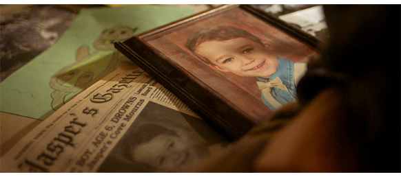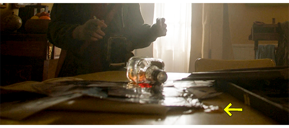 何度叩いても応答がないので、どこに鍵が置いてあるか知っているオスカーは、鍵を取り出してドアを開け中に入る。店の中では、エリックが、額に入った息子のカラー写真と〔昔のカラー写真が、色落ちせずに完璧に保存されているのはあり得ない〕、地元の新聞の一面記事を眺めている。新聞の見出しは 「6歳の少年が溺死/悲嘆にくれるジャスパーズの入り江」で、その下に、カラー写真が白黒になって転載されている(1枚目の写真)〔昨夜、エリックが海を見ていたのは、そのため〕。ドアが開いたことを知ったエリックは、店の奥から出て来て、「今日はダメじゃ、オスカー」と言うが、髪が濡れているのを見ると、「ここで待ってろ。拭く物を持ってきてやる」と言って取りに行く。オスカーは、「ここで待ってろ」と言われていたにもかかわらず、母親の躾が悪いので、エリックが入っていった部屋に勝手に入って行き、テーブルの上に置いてあった数枚の白黒写真を見ると同時に、少年のカラー写真の額を勝手に手に取って見る。そして、メモ帳を取り出すと、「これみんなあなたが撮ったの?」と書いて、2階から降りて来たエリックに見せる(2枚目の写真)。そして、メモ帳をしまおうとして、うっかりテーブルの上に置いてあった栓のしてないウィスキーの瓶を倒してしまい、ウィスキーが白黒写真の上に流れる(3枚目の写真、矢印)。