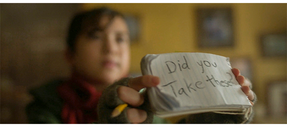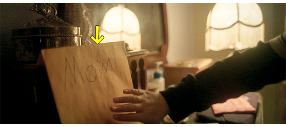 オスカーがちゃんと現像できることに満足したエリックは、オスカーの古いカメラに入っていた写真を持たせ、明日も同じ時間に来るように言い、相棒同士のように別れる(1枚目の写真)。エリックが 「気をつけろよ」と言ったので、オスカーは振り返ると、以前エリックがやってみせたように、指で凵の形を作ってみせる(2枚目の写真、矢印)。家に帰っても、母はまだバーで仕事中なので、エリックからもらった6枚の写真の入った黄色の袋に、「Mom」と書いて、机の上に置く(3枚目の写真、矢印)。