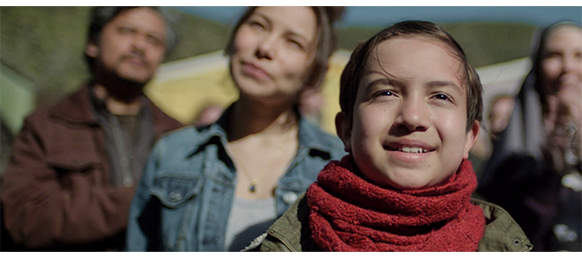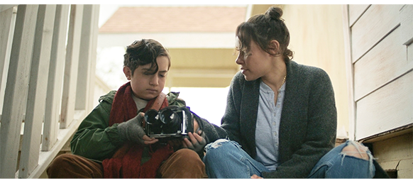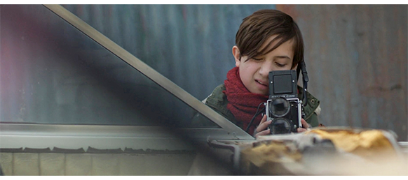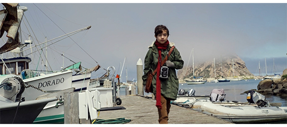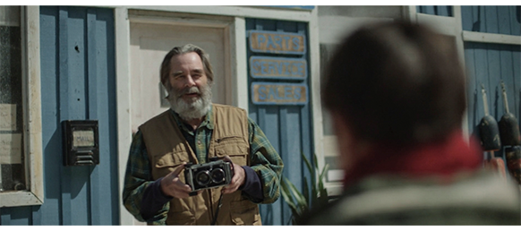 店に入ると、エリックは、1978年にこの村に来て、この小さな店を構えたと自己紹介し、カウンターの下に並べて置いてある年代物のカメラを紹介した後、オスカーと同じマミヤC220を取り出して、オスカーのカメラの横に並べて置く(1枚目の写真)。そして、オスカーのカメラを手に取ると、「あちこち動かないが、ずっとこうだったのかな?」と訊く。オスカーは、そうだとばかりに何度も頷く。オスカーは、自分のノートを見せる。そこには、モロ・ベイに来てから描いた鳥や灯台などの絵があり、そうした物をカメラで撮りたいと意思表示する。エリックは 「写真家というのは、絵を描く芸術家みたいなものなんじゃ。ただし、鉛筆の代わりに光と影を使う」と、写真とはただ単に風景や顔を記録するためのものではないことを強調する。そして、「わしがこのカメラを修理する間、予備のカメラが要るじゃろ」と言うと、自分のちゃんと動くカメラをオスカーに渡し、オスカーは笑顔を見せる(2枚目の写真、矢印)。「使い方は知っとるよな?」。オスカーは、カメラを首から掛けると再び笑顔を見せる〔この映画で、一番問題のある場面。なぜ、オスカーはカメラの使い方を知っているのか? 前にも書いたが、壊れたカメラの中には、オスカーの赤ちゃんを撮ったフィルムが残されたままになっている。つまり、8年前にカメラは壊れ、父もいないのに、オスカーはどうやってカメラの使い方を知ったのだろう? そんなことはあり得ない〕。