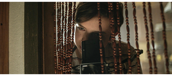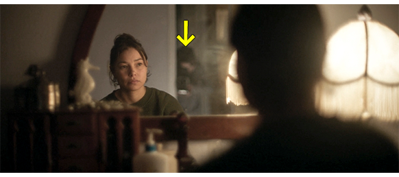 母は夜遅くなって帰ってくると、居間の小さな円形テーブルの上にカメラを置いて誇らしげに待っていたオスカーの前に行き、「どんな一日だった?」と訊く。今日の最高のニュースは、カメラのことなので、オスカーがカメラを持ち上げて見せると、自分のことで精一杯の母は、「カメラのことなどどうでもいい。あなたの一日について聞きたいの」と、無碍(むげ)な態度を取り(1枚目の写真)、オスカーをがっかりさせる。オスカーが寝る前に歯を磨いたあと、母の部屋から音楽が流れているので、カメラを持って中に入って行き、化粧を取っている母を撮ろうとする(2枚目の写真、矢印)。それに気付いた母は、大きな声で、「やめて! オスカー、ママはそんなこと大嫌い! 自分の部屋に行きなさい!」と叱る。そして、オスカーがすごすごと部屋に入って行くと、母はすぐ後を追ってきて、「ねえ、オスカー、もうすぐ学校が始まる。学校じゃ、そのおもちゃを一日中持ち歩くことは許されないわ」(3枚目の写真)「いいこと、約束しましょ。今年こそ、あなたの本当の趣味を見つけるの。他の子供たちと一緒にできることを。そうやって友だちを作らないと。楽しいわよ。みんなといろいろなことを共有するの」と、先ほどバーの主人から言われたことをオスカーに押し付ける。