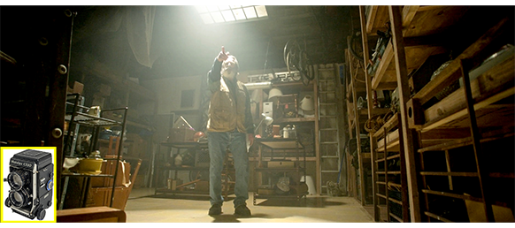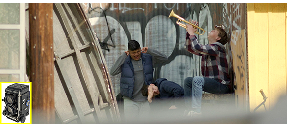 カメラを首にかけて1人でスナップ撮影に出かけたオスカーは、林で蝶を撮った後、デールが下手なトランペットを吹き、あまりのひどさに不良仲間も耳を塞いでいる光景を、ボートの陰から(1枚目の写真)こっそりパチリ(2枚目の写真、C220の印付き)。そのあと、遊歩道のような場所で、ピンクのバラの花を見つける。一方、店で他人のラジオを修理しようとしたエリックは、その向こうの開いた引き出しの中に、オスカーのマミヤC220が未修理のまま置いてあるのに気付く。そこで、そちらから先に片付けようと思い、ドライバーで裏蓋を開けると、未現像のフィルムが回収されないまま残っているのに気付く(3枚目の写真、矢印)〔こんな明るい所で開けて、撮影済みのフィルムに悪影響はないのだろうか?〕。