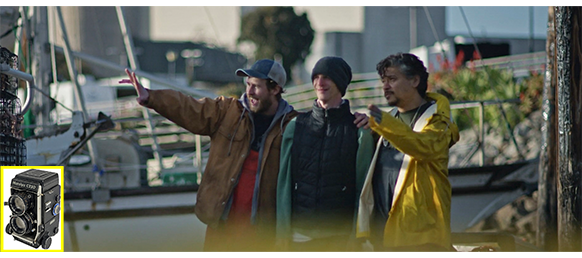 オスカーは辛抱強く叔父が戻るのを待っていたが、何事にも限界はある。グータラ男の叔父が、ようやくオスカーのいるはずの桟橋を見た時には、そこにオスカーの姿はなかった。姉が怖い叔父は、急いでオスカーを探しに行く。その頃、オスカーは、マニーたち3人が漁船の上と前にいる姿を撮影していた(1枚目の写真、左下にマミヤC220の小さな写真 ⇒ あとで、引き伸ばされ、「傑作」と評価されるもの)〔この場合、写真全体は評価されないが、黄色の点線の枠内が評価される〕〔オスカーの最初の撮影写真12枚の1つで、まだ構図が未熟なためエリックが指導する〕。漁船員の中で、一番若くて、一人だけワルのコナーは、オスカーが自分にカメラを向けているのに気付くと、「おい、ガキ! なにしてやがる!」と怒鳴る。そして、オスカーからカメラを奪うが、それに気付いたマニーが飛んできてカメラを奪い返し、「何が問題なんだ?」とコナーに訊く。「この小悪魔が、俺の写真を撮ろうとしてやがった」。マニーは 「おい、坊主、ここは遊び場じゃない。みんな仕事をしてるんだ。こんなトコで遊んでると、事故が起きるかもしれん」と注意する(2枚目の写真)。しかし、オスカーが何も言わないので、マニーは 「おい、大人に注意されたら、ちゃんと答えるべきじゃないのか?!」と叱るが、コナーが 「赤ちゃんの時に頭から落とされたのか?」とニヤニヤしながら意地悪を言ったので(3枚目の写真)、今度は、「たいていにしろ」とコナーを注意する。そこに、ようやく叔父がやってくるが、このバカは、オスカーが口をきけないと言えば万事解決するのに、①俺の甥だ、②9歳の子供だ、と無関係なことを言い、おまけに、相手に親指を立てて侮辱する〔この叔父は、その後も何度も愚行を見せ、映画の “格” をどんどん下げ続けるので、以後、あらすじではすべてカットする〕。
