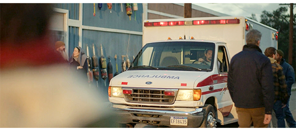 その先、あることが起こり〔オスカーの叔父が絡む不祥事だが、あまりに馬鹿げていて、映画の格を落とすだけなので、無視する〕、オスカーはエリックの店に入って行く。すると、店の前には救急車が停まっていて(1枚目の写真)、すぐに動き出す。オスカーが呆然として立っていると、「開店」の札が下がったドアが開いてマニーが出て来ると、札を「閉店」に変える。そして、1人立っているオスカーに気付く。マニーはオスカーに向かって真っ直ぐ歩いて行くと、何事か話しかける(2枚目の写真)。すると、オスカーが悲観してうつむくので、エリックが亡くなったことが分かる。オスカーは、モロ・ロックの下に行き、岩にもたれて涙を流す。夜遅くなって家に戻ったオスカーは、心配していた母に抱き着き、何も言えないので涙を流すしかない(3枚目の写真)。
