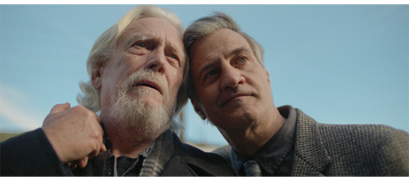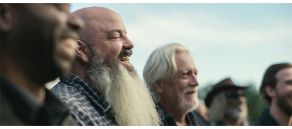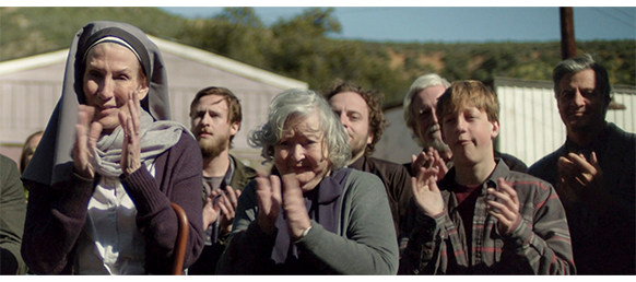牧師が、「私たちの親愛なる友エリックに別れを告げるにあたり、言葉だけでなく行動で彼の思い出を称えましょう」と言葉を結ぶ。墓地での参列者は、オスカーの母を除く集落の全員。全員の手に、エリックの写真付きの哀悼の紙が配布されている。そこには、1951年10月6日~2024年7月15日と書かれている〔この映画のアメリカでの公開は7月23日なので、その僅か8日前、このシーンを撮影したのは当然もっと前なので、公開日が予め決まっていなければこんな冒険はできない。いっそ、撮影した日にしておけばよかったのにと思う〕〔死んだ時の年齢は何と72歳。80歳は超えていると思ったのに、髭が生えていると実年齢より年上に見えるのかと驚いた ⇒ と思ったら、エリック役のボー・ブリッジスは1941年12月9日生まれ。ということは撮影時81歳。実年齢とぴったり一致している〕。牧師の言葉が終わると、フランクが “エリックが残した別れの言葉〔parting words〕” を読み上げる(2枚目の写真では、オスカーが木の陰で聞いている。なぜ葬儀に加わらないのかは分からない)。この “言葉” はかなり長く、読み上げる “言葉” と映像とはどんどんズレて行く。すなわち、映像の方が早く進行し、“言葉” はいろいろな映像を背景にして流れ続ける。「親愛なる友人の皆さん、本日はここに来て下さりありがとう。しかし、もっと大切なことは、皆さんがいつもそばにいて下さったことです。ジャスパーは、わしと美しいローズが一緒に住もうと決めた所です。そして皆さんはわしらを暖かく受け入れて下さった。皆さんの中で、わしらは人生を築きました」(3枚目の写真)。