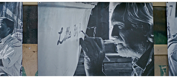 いつの段階で、練習用のフィルムから、オスカーが最初に撮影したフィルムに切り替えたのかは分からないが、最後は、白熱電球を消し、赤いセーフランプだけにした状態で、現像液に浸したフィルムを水の入ったプレートで洗い、壁の白い金属板に張り付ける(1枚目の写真)。赤いセーフランプが消え、白熱電球が点くと、エリックは12枚の写真が3×4に並んだ紙をオスカーの前に置き、「さて、お前さんはどの写真が一番じゃと思う?」と訊く。オスカーは、桟橋でマニーの漁船を撮った写真を指差す。エリックは、「ちょっと ごちゃごちゃしとらんか? つまりじゃな、これじゃ、何が言いたいのかよく分からん」と、批判する。その代わりにエリックが一番気に入ったのが、シスターを撮った写真。エリックはルーペを置き、顔と胴体の拡大した姿をオスカーに見せ(2枚目の写真、以前にC220の印付きのあった写真)、シスターについて話す。「メアリーは、村一番のきれいな女の子じゃった。ボーイフレンドのソニーがメアリーにプロポーズした時、彼は愛の証にと、ピンクのバラを庭に植えたんじゃ。そのあと、ソニーは徴兵され、戻って来んかった。この写真がお前さんの写真の中で一番なのは、シスター・メアリーの生涯を知らずとも、彼女がどんな人かが一目で分かるからなのじゃ。そこにすべてがある」。その後で、ルーペをオスカーが選んだ写真の上に置き、今度はエリックが見てみる(3枚目の写真、以前にC220の印付きのあった写真の黄色の点線の枠内)。マニーの拡大された姿を見たエリックは、そこにエリックのすべてが凝縮されていることに気付き、「わしが間違っとった。被写体にもっと近づけば、素晴らしい写真になっておった」と言う。そして、暗室から出て、さらに店から出ると、エリックは目の前の光景、新聞を頭に乗せた老人をオスカーに撮らせ、上手な被写体の選び方を教える(4枚目の写真、C220の印付き)。