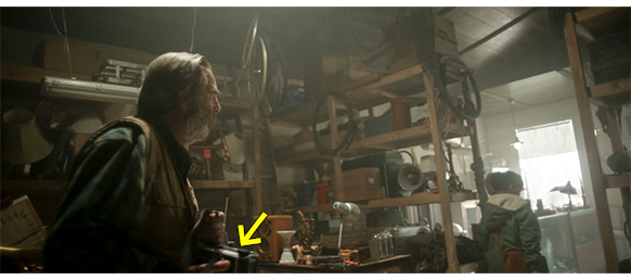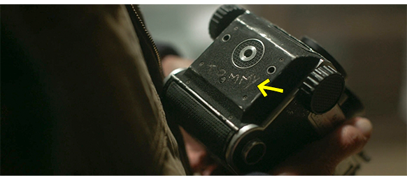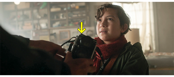 そのあとで、オスカーがうっかり音を立ててしまったので、エリックは何事かと様子を見に行き、そこに子供が隠れているのに気付き、「そこで、何しとる? どうやって、入ったんじゃ?」と訊く。オスカーは口がきけないので何も言えないでいると、エリックは少年が首から下げているカメラに気付き、店に同じ物があり、そんなレアな物が2つも存在するとは思えないので、当然少年が盗んだと思い、「待てよ、それお前の物じゃないだろ?」と指差し(1枚目の写真)、「寄こすんじゃ。それは、お前のもんじゃない。許可なく、手に取っちゃだめじゃ。二度と言わんぞ」と叱る。それでも、少年が何も言わず、カメラを返す仕草もしないことから、怒ったエリックはカメラを首から奪い取ると、背中を押して玄関の方に向かわせ、「二度とここに来るんじゃないぞ」と警告する(2枚目の写真、矢印は奪ったカメラ)。カメラに触ってみると、動くべきところが動かないので、「壊しやがって」と文句を言いながら、カメラの裏を見ると、そこに、「TOMMY」と、オスカーの父の名前が書いてある(3枚目の写真、矢印)。