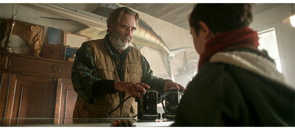 店のカメラではないと分かると、元々善良なエリックは、いそいで表のドアを開け、「ちょっと待てよ、坊や」と声をかける。オスカーが振り向くと、「このカメラ、お前さんの物だって なぜ言わなかったんだい?」と笑顔で訊く(1枚目の写真)。「トミー。これ、お前さんの名か?」。オスカーはじっと睨んでいる(2枚目の写真)。「わしの言ってること、聞こえてるかな?」。オスカーは少しだけ頷く。「よかった。なあ、坊や、出だしを間違えてしもうて〔we got off on the wrong foot〕悪かった。じゃがな… これは勘違いによるもん〔a case of mistaken identity〕なんじゃ。わしは、これと同じもん持っとるでな」。そう弁解すると、オスカーのカメラを見て、「シャッターがくっついとる。提案じゃが、このお年寄りカメラで写真が撮れるようになるか、詳しく調べてみるってのはどうかな?」と訊く。オスカーは、今度は、積極的に頷く。「わしの名はエリックじゃ。ジャスパー〔郡の名〕で写真家の仲間ができて嬉しいよ」(3枚目の写真)。そう歓迎の辞を述べると、店に入って来るよう手招きする。