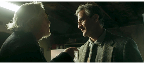 同じ日か、次の日、マニーがエリックの店にやって来て、姿が見えないので、奥の倉庫に探しに行く。マニーを見たエリックは、「どんぴしゃ、会いたいと思っておった男じゃ」と言う。「そうかい。何事だね?」。「この前、もう他に手はないって話してたじゃろ? 諦めたいって」〔実際にマニーが言った言葉は、「冬が来たら、トロール船はスクラップにし、漁業免許は最高額の入札者に売るよ」だった〕。「ああ」。エリックは、笑顔で 「負けを認め〔throw in the towel〕ようとしとる男にゃ見えんな」 と言うと、オスカーが撮った写真から “要の部分” を拡大した物をエリックに見せる(1枚目の写真)。マニーは、自分が祈りを捧げているネズミの見たいな絵のことを、「親爺は、事業を譲る前に、すべての船にこれを打ち付けたんだ。幸運を祈って」と、懐かしさと恥かしさの混じった表情で説明し、「あんたが撮ったのか?」と訊く。「わしじゃない」。「何で俺を呼んだんだ」。「マニー、あんたに頼みたいことがあってな。仲間も入り用になるじゃろう」(2枚目の写真)。その頃、オスカーはモロ・ロックの下に陣取って海を見ている(3枚目の写真)。