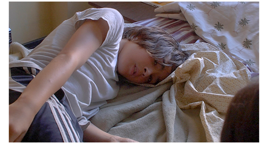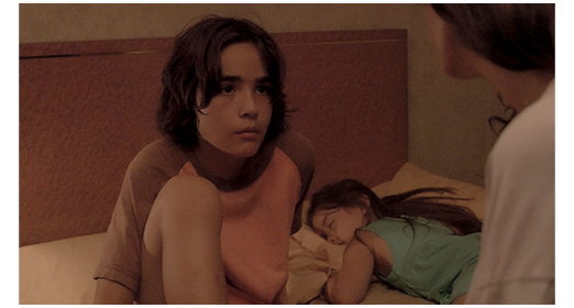 アパートに残された2人は、床のシーツに横になったアンドレアが、マットレスに横になったガブリエルに 「何かする?」と訊く。「何も」(1枚目の写真)。「何も、ってどういうこと?」。「何もだ」。消極的な兄を変えようと、アンドレアは 「英語のクラス!」と笑顔で言い、嫌がるガブリエルをくすぐってその気にさせる。ガブリエルは、最初に英語の単語を発音し、それをアンドレアに復唱させる。最初の1語は 「House」〔この映画は全編スペイン語だが、英語は空色で表示する〕とまともだったが、次の単語は「Shit(くそっ、ちぇっ)」(2枚目の写真)。3番目はもっとひどくて、「Bitch(いやな女,くそ女)」。その時、アパートの窓が叩かれ、ガブリエルに気のある中国系移民の少女が、プールに行こうと誘う(3枚目の写真)。マリアナは行きたがるが、ガブリエルはアパートにいろと言われたので行き渋るが、マリアナが頼み込むので、ガブリエルは狭い部屋の中に閉じ籠っているのにうんざりしたので、でかけることにする。