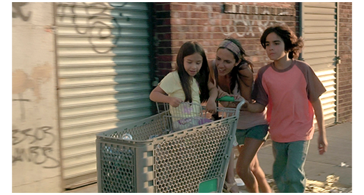 マリアナの生活が変わる転機となる第一のシーン。マリアナは、ガブリエルとアンドレアを連れて映画館に行く(1枚目の写真)。しかし、チケット売り場で21ドルと言われると、お金が足りなかったので(2枚目の写真、矢印)、子供2人分だけ払い、2人には 「映画が終わったら、すぐ出て来なさい。外で待ってるわ」と言って観に行かせる。マリアナが映画館の外で、缶入りのリンゴジュースをストローから飲んで待っていると、ダンボールや空き缶を山積みにした金属製のカートを60歳くらいの白人女性が押し、一緒に歩いている夫の白人男性が、ゴミ箱から缶を拾っては妻に渡している(3枚目の写真)。マリアナは、こんなお金の稼ぎ方もあるのだと、初めて悟る。