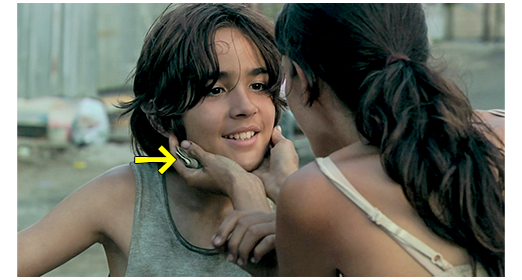 朝になり、マリアナはまだ眠っていて、ガブリエルとアンドレアが起きている(1枚目の写真)。跨線橋の天辺で一夜を明かしたジョーは、3人の前を通りすぎて地面まで行き、散乱しているゴミの中からプラ袋を拾ってくると 「やることがあるだろ。行けよ。カートは下にある」と言ってガブリエルに渡す。ガブリエルは、生き方を教えてくれたジョーに 「ありがと」と言ってポリ袋を受け取ると、階段を駆け降りる。そして、次のシーンでは、ガブリエルが一人でカートを押して歩き、ゴミ箱を見つけては、中に捨ててある缶(2枚目の写真)をカートに投げ込む。一方、目を覚ましたマリアナは、跨線橋の近くの地面に座り込むと、手近に落ちている缶をポリ袋に入れる(3枚目の写真)。しばらくすると、ガブリエルが空になったカートを押して、疲れた顔で戻ってくる。そして、7時に間に合って、集めた缶を売って得たお金をマリアナに差し出す。それを受け取ったマリアナは、ガブリエルの努力に感謝して頬にキスし、両手で顎を支えると 「ありがとう。どうしてそんなに優しいの?」と称える(4枚目の写真、矢印はガブリエルが渡したお札)。