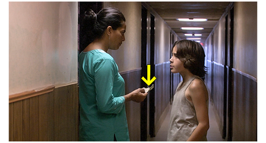 マリアナの生活が変わる転機となる第二のシーン。3人がアパートに戻ると(1枚目の写真)、部屋のドアに錠前金具を付けている見慣れぬ男がいる。人の気配を感じて振り向いた中国系移民の50歳代の男に、マリアナが 「何?」と声をかける(2枚目の写真、矢印は錠前金具)。すると、この金儲けしか頭にない嫌な大家は、「あんたの夫は何ヶ月も支払っとらん!」と怒鳴るように言う。「え、何?」。ガブリエルは 重大な内容なのですぐに母に訳して伝える。「彼、僕たち、払ってないって言った」(3枚目の写真)。「3ヶ月だ」。「違うわ、彼に言ってよ、私、1ヶ月しか借りてないって。1ヶ月。7月だけ」。「7月しか借りてないって…」。中国系の嫌な大家は、ガブリエルの話を遮り、「払わん奴は、出てけ!」と怒鳴る。マリアナは、「あたし、払う、あたし、ちゃんと働いてる、見て見て、お金ならある。受け取って」と言ってお札を見せるが、嫌な大家は、「3ヶ月分だ。1ヶ月じゃない」と言って拒否する〔それにしても、アントニオは、部屋代も払わずにマイアミに逃げていったことになる。なんという卑劣なクズ男だろう〕。