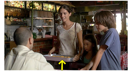 すべての道が絶たれたマリアナは、家族3人が生きていくために、得意なエンパナーダを売ってお金にしようと考える。そこで、トレイに10数個の焼いたばかりのエンパナーダを入れると、上から布巾を掛け、コロンビア料理のレストランに持って行き、売ろうと試みる(1枚目の写真、矢印)。しかし、店主は 「うちでは、よそで作ったものは出さないよ」と断る。そこで、マリアナは方針を変え、「仕事を探してるんです」と言うが、それに対しても 「求人はしてない」と断られる。トレイのエンパナーダの処分に困ったマリアナは、人混みの中を歩きながら、「エンパナーダ」と何度も言って売ろうとするが、誰も買おうとしない(2枚目の写真、矢印)。3枚目の写真は、交差点に立って、1個1ドルと破格の安値で声掛けしているエンパナーダとガブリエル(3枚目の写真、矢印)。しかし、やはり誰も買わない〔1個1ドルでは全部売れても10数ドル。材料費もかかっているので、収入はその半分。これでは、いくら移民の多いクイーンズ区でも暮らしていけない〕。