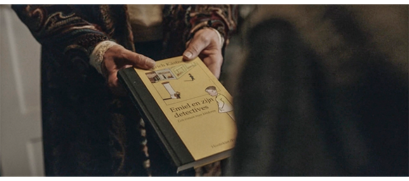 トーマスに向か合ったイスに座ったアメスフォーツ夫人は、いきなり、「あんたが来てくれて、クソ〔verdomd〕嬉しいわ」と発言する。この「クソ」に関しては原作の方が分かり易いので引用すると、トーマスは「クソ」という言葉にぎょっとした。彼は聖書学校に通っていたので、友達同士ではかなり激しく毒づいていたが、大人が汚い言葉を使うのを耳にしたのは、これが初めてだった… その後、夫人は、「うちの子たちはとうの昔に出て行ったし、夫は銃殺されたのよ。あの人はレジスタンスにいたの。分かるでしょう」と昔の話をする。その話に、トーマスはうつむく。原作:喉の奥と腹の底に、大きな悲しみがこみ上げてくるのを感じた。夫人は、トーマスの気分を高揚させようと、ポータブル蓄音機にレコードをかける。すると、ベートーヴェンの音楽が流れる。それをうっとりと聞いている幸せそうな夫人は、イスに座ったまま宙に浮かんで行く〔トーマスの想像〕。最初、それに驚いたトーマスだが、自分もイスごと宙に浮き始めると、楽しくなる(1枚目の写真)。原作:彼の耳の中でキーンと音が鳴り始めた。地球儀が、猫を乗せたまま軸を中心に回り出した。それをアメルスフォールト夫人に伝えようとしたとき、彼女のどっしりとした椅子が、低く垂れ込めた雲のように床の上に浮かんでいるのが見えた。彼がそれに気づくか気づかないかのうちに、自分の獅子脚の椅子も、まるで見えない力強い手に持ち上げられるかのように、うやうやしく浮き上がるのを感じた。彼は喜びのあまり叫びだしたい気分だった。けれど、アメルスフォールト夫人の熱心な横顔を見て、この音楽が流れるときには椅子が宙に浮くのは当たり前のことなのだと理解した。トーマスは、空想で、素敵な庭を歩いているエリシャを上空から見下ろす。彼女は、真っ白なロールスロイスの前にいて、その後ろには立派なお城が見える(2枚目の写真、矢印はエリシャ)。因みにこの場所は、オランダから僅か1.5kmドイツに入った所にあるアンホルト水城〔Wasserburg Anholt〕。私が泊った時に撮った写真を3枚目に示す。音楽が終わり、我に返ったトーマスに、夫人が 「将来はどんな大人になりたいの?」と訊くと、トーマスは 「幸せ。僕は将来、幸せになるよ」と、父に虐げられた現状からの脱出を夢見る(4枚目の写真)。夫人は、「それはクソ素晴らしい考えね。幸せって、何から始まるか知ってる? もう怖がらなくなることからよ」と、非常に重要なことを教える。そして、トーマスが帰る時、夫人は「この本は、怖がることなく不正と戦った少年の物語よ」と言い、『エーミールと探偵たち』を貸し与える(5枚目の写真)。原作では「あんたにあげるわ」。