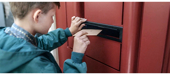 翌日、トーマスはエリシャからの返事を待ち焦がれ、自宅のドア・ポスト横の階段の一番下の段に座ってじっと待っている〔前に書いたように、階段を登った上にトーマスの家がある。典型的な上階住戸〔Bovenwoning〕〕。すると、ポストから1通の封筒が入れられ、床に落ちる。その音を聞いたトーマスは、走っていって封筒を拾うと、封筒の宛先も何も見ずに、そのまま外に走り出て、大きな木が等間隔に植えてある道路の反対側の野原を走り、その端まで行くと封筒を開け、中の手紙を取り出す。そして、エリシャからの返事だと思い、期待して読んでみると、そこには短く、「夫が妻を殴るのは、自らの名誉を汚す行為です〔Een man die zijn vrouw slaat, onteert zichzelf〕)」と書いてあった(1枚目の写真)。エリシャの手紙とは思えないので、封筒の宛先を見ると、「クロッパー氏へ」と書いてあり、次に封筒の裏を見ると、「アメスフォーツ夫人より」と書かれている。期待した手紙でなかったことに腹を立てたトーマスは、封筒をくしゃくしゃにして茂みの中に捨てるが、手紙に書いてあったことの重要性に気付くと、一旦捨てた封筒を拾い(2枚目の写真、矢印)、中から手紙を取り出すと、封筒は再度捨て、安全ピンを取り出すと、手紙に突き刺し(3枚目の写真、矢印)、自分のシャツの裏側に張り付ける。原作では、トーマスが都合よく安全ピンなど持っているはずがないので、トーマスは、折り畳んだ手紙をズボンのポケットにしまい、家路についた。それが正確にどういう意味なのか分かるまで、家の中のどこかに隠しておかなければならなかった」。そして、家に帰ると、「彼はポケットからアメルスフォールトさんのメモを取り出した。彼はあたりを見回した。どこに隠せばいいだろう? 箪笥の中の服の間か? いや、母が毎週その中を整理している。マットレスの下か? いや。剥がれかかった壁紙の裏か? いや、それもだめだ。彼のすぐ横、テーブルの上に『エーミールと探偵たち』が置いてあった。彼はそれを見つめ、不意にひらめいた。解決策はその本の中にあった。ピンだ。いや、もっといいものがある。安全ピンだ! でも、どうやって安全ピンを手に入れればいいだろう? そうだ! 母のエプロンが目に浮かんだ。彼は階段をこっそり下り、台所へと忍び込んだ。そこには、フックにエプロンが掛かっていた。吊り下げ用の紐ではなく、安全ピンで留めてあった。彼はフックからエプロンを取り、安全ピンをパチンと外すと、ザッとそれを手に入れた。彼はエプロンをそのままフックに引っ掛け直し、自分の部屋へとこっそり戻った。彼は2回折り畳んだ手紙を手に取り、4重になった紙の中に安全ピンをぐいと突き通した。それから、自分のシャツのボタンを外した。安全ピンを使って、シャツの内側に手紙を固定した。胸ポケットの裏側だったので、表からは何も見えなかった。彼はまたシャツのボタンを留めた。今や彼は、アメルスフォールトさんの呪文を、自分の胸に抱いていた… と書いてあり、結構大変だったことが分かる。