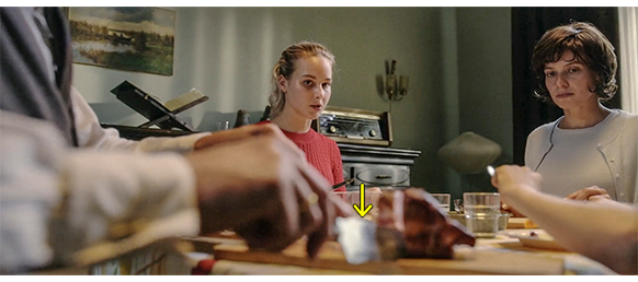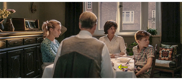 その時、1階の玄関ドアの呼び鈴が鳴る。トーマスが開けに行き、「こんにちは、ピー叔母さん」と言うと、「なんて可愛いの」と言った後で、父〔義兄〕に対し、「何てことなの! あんたの弟が、私を殴ったのよ! なぜだか分かる?」と言うと。スボンを見せる。父は、トーマスとマルホを上の階に行かせようとするが、叔母は、「いいえ、お断りよ! 誰が知ろうと構わないわ」と義兄の命令を却下し、2人に、「あんたたちのベン叔父さんはね、ズボンをはいたからって理由でピー叔母さんを殴ったのよ。あいつ、正気じゃないわ!」と言う。いつも平気で母を叩いている父は、叔母が子供たちの前で非常に不味いことを言い始めたので、何とか止めさせようと、「ピー、座って」と言うが、そんな言葉に耳を貸すような叔母ではない。「あんたが一番上の兄なんだから、こんなことは許されないって、言ってやってよ。でないと、私、家の前に看板を持って立ってやるわ。『クロッパー氏は、妻がズボンをはいたという理由で暴力を振るいます』ってね」。それを聞いた父は、本性を現わす。「ピー、男には、妻や子を導き、教え諭す務めがある。もし、従わない場合には…」。「殴るの?」。「厳しく対処する」〔いつも殴っていることがバレると困るので、直接的表現を回避した〕「それは神がお定めになったことだ。神はまた、女はスカートを、男はズボンをはくものとお定めになった。もし、あんたが神の掟に頑なに背くのであれば、あんたの夫には権利がある。いや義務があるんだ〔原作:「いや、たとえ鉄拳をもってしても従わせるのが義務なのだ」〕!」。それを聞いた叔母は、「そうか、つまり、あんたを頼りにしても無駄ってことね。でもこれだけは言っておくわ。もし彼がまた私を殴ったら、私は彼と別れてやる。そして、二度と会わない。それに、これからはズボンしかはかないわ!」と宣言し、義兄にズボンを履いた足を上げて見せる(1枚目の写真、矢印)〔母より、よほど自立心があり、暴力に対する憎しみが強い〕。叔母は、ここで、父にとって非常に困ったことを母に訊く。「ところで、その鼻どうしたの? まさか、神の掟に背いたんじゃないわよね?」(2枚目の写真、矢印)。「引っ叩かれたの」とは言えないので、母は、「つまずいちゃった」と嘘を付く。母に対する父の暴力を許せないマルホは、「水槽よね。ねえ、パパ?」と、じっと父を見ながら、痛烈な批判を込めて言う。それを聞いた叔母は、義兄の暴力による傷だと知りつつ、マルホの批判に相乗りする形で、「そうね、水槽っていうのは、ぶつかるとひどい目にあうものね。私もよく水槽にぶつかるわ。特に、鼻からね」と言うと、義兄に向かって、「あんたって、弟と同じで臆病者ね」と貶すと、「さあ、そろそろ、信心ぶってるくせに暴力をふるう夫のもとへ帰らなきゃ。でも、目にもの見せてやるわ。つけ上がるなって!」と言い、最後に母の肩に手を置くと、じっと顔を見つめながら、「そう思うでしょ?」と、自立を促す。叔母は、そのまま出て行くと思わせ、義兄の前まで来ると、吸っていたタバコの火を、皿の肉の真ん中に何度も押し付けて消し(3枚目の写真、矢印)〔原作にも、ピー叔母さんは、父の皿の上でタバコを押し消した と書いてある〕、ドアをバタンと閉めて出て行く。原作にきわめて忠実なシーン。