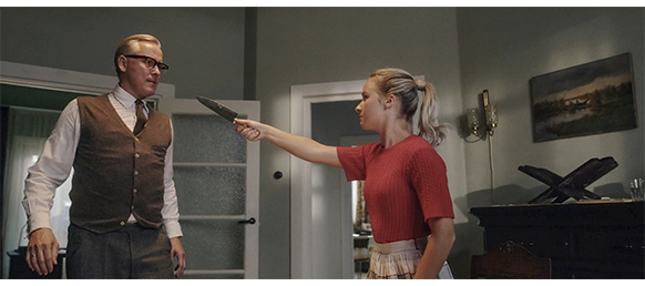 この映画で最も秀逸で衝撃的な場面。父が母を叩く前に、父の “すごくよく切れる” 肉切り包丁をつかんだマルホは、その包丁の切っ先を父に向ける(1枚目の写真)。原作では、ここで、「彼女は天使のようだった」と、トーマスは『すべてを書いた本』に書いた。「天界で最も危険な天使。燃える剣を持ったあの天使だ」という一文が入る。そして、「二度と手を出すな!」と強く命じる〔原作では、「手出しはさせない。もう、たくさんよ。我慢も限界だわ」〕。それに対し、ずっと父の支配下で “共依存に近い状態” にあった母は、「マルホ、その包丁を置きなさい!」と言うが、マルホは、母には 「ママもトーマスも、神を怖がる必要なんてないわ。だって2人は優しいもの」と言い、次いで父に向かって、「あんたは優しくない。私がやらない〔刺さない〕なんて思わないことね? 私はあんたに似ているの。私も優しくなんかないわ」(2枚目の写真)「あんたが何を信じていようが、知ったことじゃない! でも、二度と暴力は振るわせない!」と怒鳴るように言う(3枚目の写真)。ここで、ようやくマルホは、包丁を父の首から離す。そして、「あんたは、悪いことだと知ってたのに、それでも続けた。近所に気づかれさえしなければいい」〔原作では、さらに、「親戚に知られなければいい。仕事場の人にバレなければいい!」〕「そうでしょう?」と最後を〆る。面目が丸つぶれになった父は、「出て行く」と言い、すっといなくなる〔ショックは受けても、反省した様子はゼロ〕〔原作では、もっと反抗的:父は立ち上がり、怒り狂って向き直ると、ドアへと大股で歩きだした。彼は立ち止まり、充血した目で部屋の中を睨みつけた。「お前たちと同じ屋根の下にはいられん!」と彼は怒鳴った。「私はホテルに泊まる」。彼はドアを乱暴に開け放ち、廊下へと消えた。それから、階段をドカドカと駆け下りた。表のドアが、落雷のような音を立てて閉まった〕。父がいなくなると、母は 「なんてことを…あなたは何をしたの?」と、非難するような発言をする、①夫に引っ叩かれるのを救ってもらったのに、②その前には、ピー叔母から「そう思うでしょ?」と、自立を促されたのに、何と情けない母だろう。しかし、マルホが、「終わらせたのよ」と言い、泣き始め、泣きながら、「私が終止符を打ったのよ。それとも、このままあいつに殴られ続ける方が良かったの?」としゃくり上げると、母も ようやく目が覚め、マルホを抱き締めて 「本当にごめんなさい」と謝る(4枚目の写真)。マルホは。トーマスのお尻を叩く時の木のスプーンを2つに折って窓から捨てる。一方、父は、逃げ出しのではなく、その夜遅く、近所が寝静まってから、こっそり家に戻ってくる。心配した母が待っていてくれたのに、ありがとうとも言わず、「もう寝る」とだけ言って、勝手に寝てしまう。この男には、もう一段の強烈な教訓が必要だ。原作でも、「ホテルに泊まる」と言っておきながら、父は一時間ほど戻らなかった。それから、彼は帰宅した。彼は猫のように忍び足で階段を上がり、隣の小部屋に引きこもった。事務所の仕事があるのだと、彼は言った… と書かれている〔ホテル代がなかった?〕。