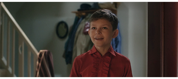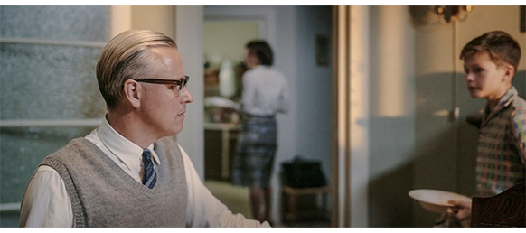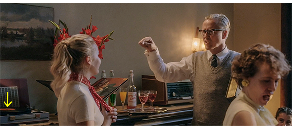 シャツが違うので別の日、トーマスが居間の窓から見ると、お向かいがとても騒がしいので、1階のドアまで下りて覗いてみる。すると、エリシャの父が車のトランクから箱に入っていない中古のTVを取り出し、家に運んでいる。アンテナを手にしたエリシャは、トーマスを見つけると、「見に来て」と呼ぶ。エリシャの父は、TVを居間に置くと、隣の部屋の窓の近くで、小型アンテナをいろいろな高さと角度で試し、TVにちゃんと映像が入るようにする(1枚目の写真、矢印はアンテナ)〔アンテナのすぐ左にあるのは、1961年4月12日に打ち上げたボストーク1号によって生まれた典型的なスペース・エイジ・デザインの照明器具〕。居間では、母と4人の子供が、嬉しそうにTVを見る(2枚目の写真、矢印はTV、子供の1人は後ろにいて見えない)〔映画の設定の1961年の夏頃には、TVのブラウン管がこんなに丸くなく、もっと四角に近かった〕。そのあと、トーマスはエリシャの部屋に連れて行かれる。最初はエリシャがベッドの上で、トーマスは窓辺のイスに緊張して座っていたが、エリシャが 「こっちに来て」と言ったので、エリシャの隣に座る。トーマスは、思い切ってエリシャの義足の革に触り、2人とも笑顔になる。原作には全くないシーン。それにしても、なぜこのシーンをわざわざ追加したのか、全く理解に苦しむ。というのは、このシーンがあるために、映画の時代設定が、原作より10年後の1961年になってしまったからだ。