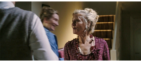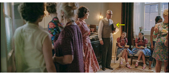 映画は8月17日の午後7時近くに変わる。父が食後の食卓で『出エジプト記』の第40章33-34節を読み上げていると〔なぜ、いきなり第40章に飛ぶのか? 原作では第11章の4-6節〕、父以外の3人がドアの方を向く(1枚目の写真、矢印は聖書)。母は、「ごめんなさい、あなた。急いで片付けないと」〔原作では、父に対してではなく、マルホに対して、「さあ、早く片付けて皿を洗わないと」〕と言って席を立ち、マルホも片付け始める。父が、「何事だ?」と驚いて訊くと、トーマスが皿をキッチンに運びながら、「お客さんが来るんだ」と答える。「どんな客なんだ?」。「ピー叔母さん」(2枚目の写真)。母は、夫に、「あなた、テーブルを脇にどけて、イスを並べてくださらない」と頼む。「ピー1人のためにか?」。「もっとたくさんの方が見えるの。あなたも着替えたら?」。「どうして今になって聞かされるんだ!」。マルホが、「ごめんね、パパ。忘れてたの」と言い、トーマスが、「パパも招待されてるよ」と言って、招待状の入った封筒を渡す。父が受け取って中を見ようとすると〔原作には、招待状は存在しない〕、ドアのベルが鳴る。そこで、父がドアを開けに行くと、最も嫌いなアメスフォーツ夫人が最初に入って来て、2番目がピー叔母(3枚目の写真)〔原作では、最初がピー叔母、その後ろにマグダ叔母と、ビー伯母、そして、エリシャ、アメスフォーツ夫人、4人のお婆さん〕。以下のシーンは映画だけ。夫人は、ムッとした顔の父に向かって 「トーマスが、私たちを “幸せな人々の会” に入れてくれたの」と言い、「あなたも招待されたんですか?」と疑わし気に訊く。「何の会ですって?」。すると、次から次へと入って来た女性の一人が、「すべて、そこに書いてありますよ、クロッパーさん」と言い、招待してくれたトーマスに感謝のキスをする。父は、ようやく封筒を開き、中の招待状を見る。居間では、邪魔な聖書をどけようとした夫人から、父が大切そうに聖書を受け取る。居間は、招待された女性たちで一杯になり、聖書を手にした父の存在は “異様” でしかない(4枚目の写真、矢印)。