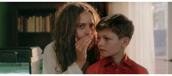 ここで、映画には触れられていない部分の原作の重要な部分を引用しよう。「あとで水槽の水を替えるわ」と母が言った。「それはならん」と父が言った。「魚たちは死に、悪臭を放ち始めた…そう聖書に記されているのだからな」。母はもう何も言わなかった。マルホは学校の課題で読まなければならない本の話を始めた。誰も彼女の話を聞いていなかった。全員が食事を終えると、父は聖書を開いた。彼は言った。「覚えておくんだ、マルホ。この世に本物の本はただ一冊、聖書だけだ。お前が学校のために読まねばならん本は、ファラオの魔術師に似た、罪深い人間たちが書いたものだ。奴らは本を書くが、それは紛い物の本にすぎん」。「ふうん」とマルホは言った。彼女は自分の爪を眺めていた。「知性を持って読むんだ。そして、お前の心を聖書と共に置くのだ」と父が言った… ここで、母が、危機に瀕した息子を救おうと、トーマスを呼びつけ、ホースを水槽に突っ込み、サイフォンの原理で水槽の赤い水を、床に置いたポリバケツに入れ始める(1枚目の写真、矢印)〔バケツが小さ過ぎるので、何度も交換する必要がある〕。それを見た父は、「今すぐ止めるんだ」と、母に命令する。母は、「いやよ」と反抗する。原作の記述:母が鍋を持って入ってきた。「バケツを持ってきなさい」と彼女は囁いた。「おいで」。トーマスは空のバケツを手に、母の後をついていった。2人は居間を通って、水槽のある奥の部屋へ向かった。母は照明カバーを脇に寄せた。「サイフォンはどこ?」と彼女は尋ねた。トーマスはバケツを床に置いた。彼は水槽の下の戸棚を開け、ゴムホースを引っ張り出した。母はホースの一方の端を水に入れ、もう一方の端から吸い込み始めた。「何をしてるんだ?」と父が尋ねた。2人は父が近づいてくる音に気づかなかった。母はホースを口に含んでいたので、答えることができなかった。トーマスは父の顔を見上げた。「イエス様」と彼は思った。「僕たちを助けて!」。母は口からホースを離し、それを下へ向けた。バケツの中に、赤い水が音を立てて流れ落ちた。「水槽の水を替えてるの」と母が言った。父はポケットに手を突っ込んだ。「私は何と言ったかな?」と彼は尋ねた。「替えなきゃだめよ」と母が言った。「じゃないと魚が死んでしまうわ」。「それは、うちの邪悪な魔術師にとって良い教訓になるだろうよ」と父は言った。「私はそうは思わないわ」と母が言った。「お前、聞こえたはずだ」と父が言った。「今すぐ止めるんだ」。「いやよ」と母は言った。「3つ数えるぞ」。母のことが心配になったマルホは、「パパ、幾何学の宿題を教えてくれる?」と頼む。しかし父はそれを無視し、母を睨んだまま「1」と言う(2枚目の写真)。母は、動かずにじっと父の顔を見ているので、父は、一歩前に進み「2」と言う。マルホは、再び「パパ!」と声をかけるが、父はそれも無視。さらに、母に近づき「3」と言う。トーマスは、父の暴行を阻止しようと、父の足元にあったポリバケツを蹴飛ばして水浸しにするが、それと同時に、父は、母の顔を思い切り引っ叩く。トーマスは、父の右腕を掴んでそれ以上の暴行を阻止しようとするが(3枚目の写真)、簡単に突き飛ばされる。母は、自己防衛して叩き返そうとするが、父の次の渾身の一発で(4枚目の写真、矢印)、床に倒れる。