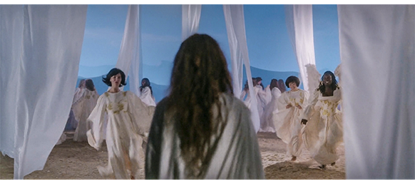 イエスは、円満な結果をみて、「また会おう、トーマス。君は、私の一番の友だ」と、別れの言葉を言う。トーマスは、「天使たちに、よろしくって言ってね」と頼む(1枚目の写真)。イエスは、「もちろんだよ」と言うと、天に向かって飛んで行く。原作では、会の最中ではなく、トーマスがベッドに入ってからの会話。2人の話し合いの最後に、“映画の中頃で トーマスがエリシャにキスされた後の会話” が、実はここに入る。もう一度繰り返そう。トーマス:「エリシャは僕を待っていてくれると思いますか?」。イエス:「そう思うよ」。「彼女が革の義足を取り外すところを見るのは、怖いでしょうか?」。「君はもっとひどい修羅場をくぐり抜けてきたろ」。そして、その時には言わなかった決定的なトーマスの台詞。「実は 僕、彼女と結婚するつもりなんです」。これに対し、イエスは彼の手を頭の上に置き、「私の祝福を授けよう」と言う。それからトーマスは眠りに落ち、イエスは天へと昇って行く。ここからは、映画と原作は同一。上界に戻ったイエスに、数人の天使が「トーマスはどうでした?」と尋ねる(2枚目の写真)。「彼なら大丈夫だ」。「すぐに彼を連れて来るのですか?」「私は、彼のためにトランペットを吹きたいのです」。イエスは、微笑みながら、「君たちにはトーマスを射止めるチャンスなんて、万に一つもないよ」と言う。「どうしてですか?」。「君たちの中には、歩くたびにギシギシと鳴る、革でできた脚を持っている者なんて誰もいないからね」(3枚目の写真)。イエスは、あくまでトーマスの空想上の存在なので、これも、朗読会で、「ボーイフレンド」と言われたトーマスが描いた夢の世界。この場面は、映画と原作で同じでも、映画では、トーマスが一度天界を訪れているので違和感はない。しかし、原作ではそのような場面がないので、どうして天使たちにそんなに人気があるのか分かり辛い〔映画の方が上手い〕。