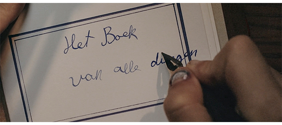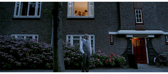 1961年のアムステルダムのザウト〔Zuid、南〕地区にあるテラスハウス〔一戸建て感覚の集合住宅〕が舞台。原作では、アムステルダムの中心部の南南西約3kmにあるヤン・ファン・エイク通り〔Jan van Eyckstraat〕と明記されている(すぐ北にノールデル・アムステル運河〔Noorder Amstelkanaal〕が東西に通っている)。ただし、映画のように、通りの上にゲートハウスはない〔ロケ地は、ラトビアのリガ〕。9歳になるトーマスは、1冊の白紙の本を取り出し、表紙をめくった本扉にどんな題名を書こうか考えたが(1枚目の写真、矢印は題名を書く場所)、いい案が思いつかないので、次のページをめくり、ペンをインクボトルに入れる。原作では、本の題名はすでに決まっている。彼はペンを手に取り、こう書き記した。「雹が激しく降り注ぎ、木の葉が弾き飛ばされた。それは実際に起きたことだ。1951年の夏、私が9歳の時、ヤン・ファン・エイク通りにて」。彼は考え事をしようと窓の外を眺めた…そして彼はこう書いた。「いつか、僕は幸せになる」。場面は変わり、小部屋に置いてある熱帯魚の水槽越しに、食卓に座っている一家4人が映る(2枚目の写真)。食卓では、父が 肉切り包丁を何度も “研ぎ棒” に擦り付けて研いでいる。トーマスが、相手を特定せずに、「本って何について書いてあるんだろう?」と訊く(3枚目の写真)〔原作と同じ、もしくは、ほぼ同じ台詞は青色で表示する〕。16歳の姉マルホが 「恋愛とかね。でも、君にはまだ早すぎるよ」と言い、トーマスは 意地悪な返事に舌を出す。