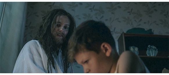 トーマスは、自分の部屋に戻る。彼の部屋の、窓と反対側の壁には、十字架に縛り付けられたイエスの絵が掛かっている(1枚目の写真)。トーマスは、絵の下のベッドに横になって、神に話しかける。「聞こえます? そしたら、父を罰してください。 いますか? 僕、トーマスです。もしあなたが存在するなら、僕を助けてくれませんか? どうしても、お話ししたいんです。どうか、神様」(2枚目の写真)。次のシーンでは、窓辺の机に座ったトーマスが空を見上げ、「お願い、存在して。そうすれば…」と言い、『無題の本』に、「父を罰して欲しい」と書く。すると、背後の絵のイエスの手が、十字架から離れる(3枚目の写真、矢印)。「だって、父はママを殴ったから。彼を許してはいけない。決して許してはいけない」。そこまで書いたところで、いきなり声がする。「やあ、トーマス、元気かな?」。「いいえ」。「一体どうしたんだ?」。「ママを殴っちゃダメなんです」。「誰が?」。「ご存じでしょ?」。「なんてことだ。彼は正気を失ったのか?」(4枚目の写真)。「正直に言わせてもらえば、あなたは僕たちの役に立っておられません」。「一体全体どうしたんだ? 私は人類を救ったんだよ!」。「失礼ですが、『何から』ですか?」。それを聞いたイエスは、何ともならないといった仕草をすると、窓の外に天に登る階段を作り、そこから外に出て行く。トーマスは、「ねえ、あなたの父上と話をさせて。一緒に行ってもいいですか?」と声をかける。そして、イエスの後を追って行く。原作では、トーマスの部屋で会話が続く。「失礼ですが、『何から』ですか?」を聞くと、主は眉間にしわを寄せた。「おいおい」と彼は言った。「そんなの、君が一番よく知っているだろう」。「さあ、僕は何も知りません」とトーマスは言った。「わかった、わかった」と主は言った。「大きくなれば、そのうち分かることだよ」。「そういうことですか」とトーマスは言った。主イエスはトーマスを見つめ、彼の手をその頭の上に置いた。「君は強いよ、トーマス」と彼は言った。「君が強いのは、君が優しいからだ。そのことを覚えておくがよい。私たち天の者は君を誇りに思っている。信じるかな?」。