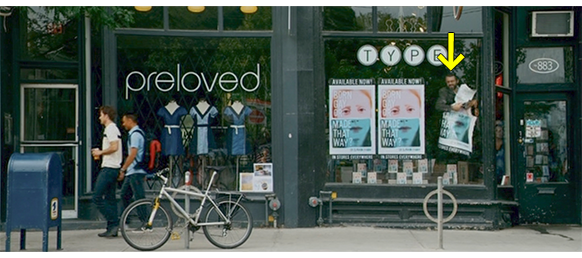 ここで、画面は切り替わり、全く別の一家が登場する。最初に印象的な形で現れたのが、ヘンリーの異母姉。彼女が中学の廊下を歩いて行くと、周りから一斉に 「Lesbo(レスビアンを軽蔑した用語)」が連呼される。それを一切無視し、無表情なオードリーが廊下の真ん中を歩いて行く(1枚目の写真)。オードリーは自分のロッカーの前まで来ると、そこには、彼女が 「Lesbo」とはやし立てられる原因となった、“オードリーの父が出版したばかりの本の表紙と裏表紙のコピーが一杯貼り付けてある(2枚目の写真)。その本の標題は、『Born Gay or Made That Way(生まれながらの同性愛か、それともそうなったのか)?』というもので、レスビアンの娘オードリーについて分析したもの。オードリーは、父が、自分のことをあからさまに世間に公表し、そのために全校生徒から からかわれる事態となったことに対し、怒り心頭。ロッカーに張られたコピーを、「大嫌い」と言いながら すべて破り捨てる。その頃、オードリーの父オハラ博士は、TVの番組に出ている。「あなたがお嬢さんにしたことは児童虐待ではないかと思っている人が大勢います」という厳しい問い掛けに対し、オハラ博士は、「私はジェンダーバイアス〔男女の役割について固定的な観念を持つこと〕や、人々を非人間化する固定観念の束縛がないように娘を育てようとしたのです」と弁解に追われる。そして、次のシーンでは、大学のそばの書店のショーウインドウに “話題の新作” として貼られていた本の表紙のポスター3枚を剥がし(3枚目の写真、矢印はオハラ)、本屋に置いてあった本をすべてカートに投げ込む。
