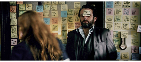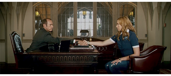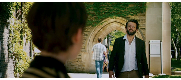 この結果を見たオハラは、視覚的にもヘンリーに確信してもらおうと、外は嵐なのに、窓と廊下側のドアを開け放つ。すると、猛烈な風で次々と付箋紙が剥がれ、部屋の中を舞う付箋紙の中で、オハラは喜びの叫び声を上げる(1枚目の写真)。付箋紙は窓からどんどん外に出て行き、翌朝、構内を歩くヘンリーは、それを写真記憶として記憶に留める。オハラが約束を守って、ヘンリーに関する本など絶対に出版しないことが分かったので(2枚目の写真)。