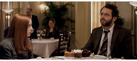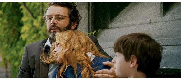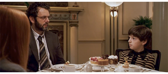 ここで、映画は12年以上前に戻る。医師に検査結果を訊きにきたオハラは、精巣癌だと告げられる〔12年経っても健康なので、医師のミス?〕。そして、このいい加減な医師は、将来2人目の子供が欲しくなった時のためにも、精子バンクに精子を保管しておくことを勧める(1枚目の写真)。そこに、一緒に話を聞くことになっていたオハラの妻が、1時間遅れてやって来ると、医師は 「アリス」と親しげに声をかけ、アリスは 「ごめんグンター、遅刻しちゃった」と笑顔で医師のところまで歩いて行き、頬にキスする。医師は、かなり膨らんだアリスのお腹に優しく手を触れ(2枚目の写真)、アリスは 「優しいのね、グンター」と言いながら笑う。オハラは、癌の宣告を受けたことよりも、アリスと医師の異常な仲の良さに非常に違和感を覚える〔お腹の子は、自分の子ではなく、グンターの子じゃないかと疑い始める〕。そのあと、オハラの横のイスに座ったアリスは、グンターに対して取った態度とは違い、冷たい顔で、夫に対し 「私を待たずに始めたの? スラヴキン、仕事を早引けしてここに来たのよ。あなたって、すごく利己的なのね」とオハラを非難する。オハラが 「君の姓に変えたじゃないか」と言うと、「アリス・ストラヴィノウスキー? みんなに何て思われるか」と笑う。ここで、現代に戻り、オハラは、ヘンリーに 「腫瘍医に妻を奪われた。だが、少なくとも私は健康だ。フラワーズ博士よりはずっと」と言う。ヘンリーが 「フラワーズ博士はどうなったの?」と訊くと、①フラワーズはアリスと結婚し〔妊娠中の “将来のオードリー” を出産してから〕、②その後のフラワーズはアリスの尻に敷かれっ放しで、③最後には、ゴミ出しの最中に事故死した、と教えられる。次に、オハラがヘンリーに質問する。「君は、今、学校に行ってないわけだ。どうする気だ?」。「そのことは、まだパトリシアと話してない」。「パトリシアって?」。「僕のお母さん」。「君は、お母さんをファースト・ネームで呼ぶのか?」。