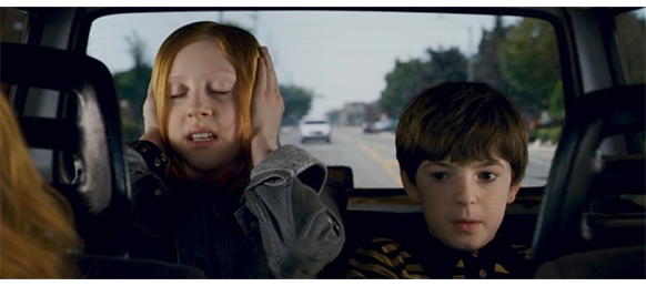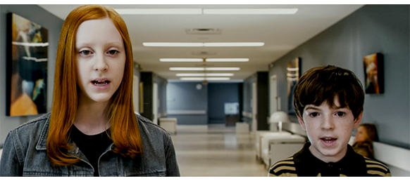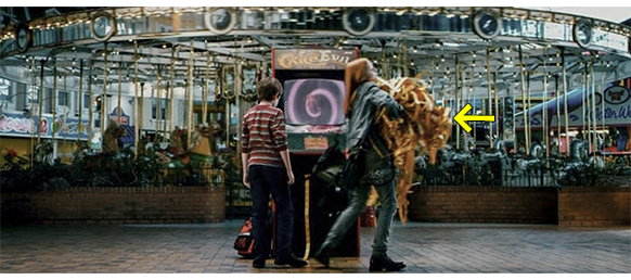一部のシーンは、パトリシアがオハラに会う前。トイレに行くと嘘を言って中学から逃げ出したオードリーは、玄関を出た所で、待ち構えていたヘンリーとバッタリ出会う。オードリーが 「ボコボコにしてやりたい」と言うと、ヘンリーは 「怒って当然だよ。いろいろ迷惑かけちゃったから」と 素直に謝る。「大学にいるんじゃなかったの?」。「学校にいなくていいの?」。「質問に質問で答えるなんて 許せない」。「そうだね。僕は、大学にいるべきなんだ」。「じゃあ、ここで何してるの?」。「君のことが心配で」。その言葉で、ヘンリーへの敵意が消えたオードリーは、「学校をサボったことは?」と訊く。「ないよ」。それを聞いたパトリシアは、ヘンリーの前を通って、学校の外に歩いて行く。「どこに行くの?」。「Anger-obics〔怒りを鎮め、解決策を見つけるのに役立つ一連のテクニック〕」。この先に、前節の、パトリシアとオハラのシーンが入る。そのあと、オードリーは、ヘンリーを屋内型遊園地に連れて行く。エスカレータに乗りながら、ヘンリーは、「僕、遊園地に来たの初めて。何かに乗ろうよ」と言う(1枚目の写真)。「乗らないわ」。ヘンリーは、オードリーについての本を読んでいるので、「暴露療法(エクスポージャー)は 『眩暈恐怖症の強烈な感覚』を乗り越える最善の方法だよ」と言い、オードリーを誘って “なるべく過激でないライド” に乗る。席に座ると、興奮したヘンリーは、「Jesus H. Christ」と言う。「その、Hって何なの?」。「知らない。HolyのHかな?」。「何でも知ってるのかと」。「何でも覚えてるだけ」。「何でも?」。「僕が見たものはね」(2枚目の写真)。「いつから」。「生まれた時から」。その時、ライドが前進を始め、オードリーは悲鳴を上げ始める。しかし、最後の頃には悲鳴が止まる。そして、一旦停止したライドが後ろにバックし始めると、悲鳴が微笑に変わる。そして、再度前進を始めると、ヘンリーより先に、両手を上げて叫び始め、ヘンリーも同調する(3枚目の写真)。そのあと、2人は2種類のライドに仲良く乗る。姉と弟のように。