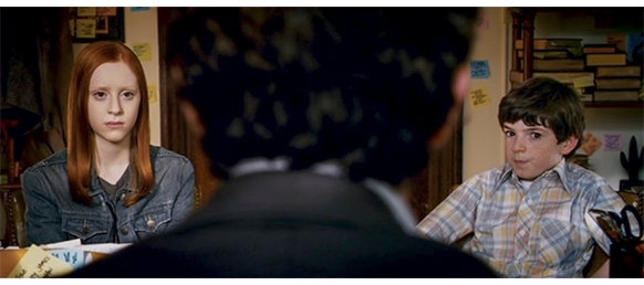 部屋の片隅で、仲直りしたパトリシアが、ビリーと昔の写真アルバムを見ていると、部屋の反対側ではヘンリーとオードリーが話し合っている。「無理していなくても いいんだよ」。「私にだって、上品で、礼儀正しいフリくらいできる。ティーンエージャーだから」。「12歳だ」。「来週13歳になるわ。だから、あんたなんか無視するフリをして楽しんでもいいんだけど、やめとくわ。だって、あんたは私の弟なんだから」。その言葉でピンと来たヘンリーは、オードリーを見つめる。「グンターがパパじゃないと分かってホッとしたわ。バカな奴だったから」。「報告書を見たんだね?」。オードリーは笑顔で頷く(1枚目の写真)。「てことは、君は、賭けに負けたんだ」(2枚目の写真)。オードリーは、ヘンリーを突き飛ばす。そのあと、パトリシアとビリーが昔のアルバムを見ながら意味のない会話を続ける。そして、オードリーは、ラベルライターでテープに文字を打ち始める(3枚目の写真)。