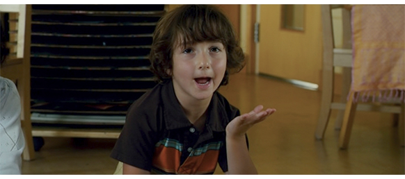 次のシーンは、5歳のヘンリー。教師が、同じ年頃の幼児を対象に、「Y」の字を示し、何度も発音させ、「Yで始まる単語を教えてくれる子、いるかしら?」と訊く。すぐに手を上げたのはヘンリー。今までも生意気な態度で嫌われていたらしく、教師は、諦めた顔で 「ヘンリー」と言う。ヘンリーは、「なぜ(Why)?」と訊く。YでなくWから始まる単語だったので、教師は間違いを指摘し、他の子供達も 「このバカ」、「変人」と悪口を言う。ヘンリーは、「僕は、『なぜ』 こんな下らないことやってるの、という意味で言ったんだ」と言い(1枚目の写真)、怒った教師はヘンリーを停学処分にする。幼稚園の前で、迎えに来たパトリシアは、小学校に入学させることにする。「早熟な子は罰するんじゃなく、先に進ませないと!」(2枚目の写真)。