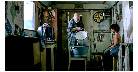 カルーゾがいなくなると、チンピラは、バルブーに 「おい、道化師!」と大声で呼びかけと〔声の厳しさから、バルブーは 理解できなくても、自分に言われたことは分かる〕、手に持った長い鞭を巧妙に使って、照明を消す。その後、移動式住居の間を、チンピラが乱暴にバルブーの手を引いて歩かせ、一番左にある薄赤い住居のドアから、バルブーを入れる(1枚目の写真、矢印)。バルブーと一緒に中に入ったチンピラは、ベッドにダラダラと横になっていたマルセルのシャツを掴んで引っ張り起こすと、壁に頭を付け、「怠けモン! 寝てるだけで、ロクな稼ぎもねぇ。もう一度、痛い目にあいてぇか」と脅すと、ナイフを取り出し、「顔を切り裂くぞ。いいのか? 何とか言え!」と怒鳴る(2枚目の写真)。マルセルは 「やるよ」と言う。ナイフをしまったチンピラは、「新入りだ。仕込んでやれ!」と言って出て行く。チンピラがいなくなると、マルセルは、机らしき古い家具を蹴飛ばし、「くそったれ野郎!」と怒りをぶつける。そして、バルブーには、「おい、相棒、どっから来た?」と訊く。返事がないので、バルブーにはドイツ語が分からないと分かる。次に、「俺… アルバニア、ティラナ〔アルバニアの首都〕」と、ゆっくり言うが、それでも通じない。そこで、「アルバニア、アルバニア」とくり返し、両手をバルブーに向け、「お前は?」と訊くと、何となく意味は通じ、「ウクライナ(Україна)」と答える。マルセルは、握手の手を伸ばし、「マルセル」と言い、バルブーは 「バルブー、サーカスの王様」と言って手を握る。マルセルは、「サーカスの王様か… 俺も似てる。巧いこと、おだてられた。気をつけな。ごまかしたら、ぶちのめされる。団結だ、お互いに」と注意すると(3枚目の写真)〔こんな長いドイツ後、バルブーに分かるハズがない〕、最後に頭をポンと叩き、「相棒(Kumpel)」と言う。